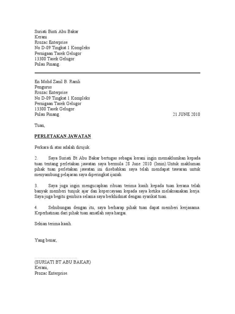 Surat berhenti kerja adalah surat pemberitahuan kepada hr atau majikan sekiranya mereka ingin meletak jawatan daripada pekerjaan mereka sekarang. Surat pemberhentian kerja sementara ini biasanya dilakukan karena suatu hal. Berikut adalah contoh mudah surat rasmi berhenti kerja terbaik yang boleh diguna pakai. 0 ratings0% found this document useful (0 votes). Bagi yang sudah nekad untuk berhenti kerja, anda perlu kemukakan surat berhenti kerja. Contoh surat berhenti kerja hotel dengan notis sebulan. Sekiranya perjanjian sewaktu anda masuk bekerja menetapkan syarat bahawa notis satu bulan untuk berhenti kerja, anda perlu mengikut syarat tersebut. Dinasihatkan agar semak semula surat tawaran kerja terlebih. Khas untuk mereka yang nak berhenti kerja tapi masih pening nak buat di sini dikongsikan surat berhenti kerja yang mudah dan ringkas dalam bahasa melayu dan inggeris bagi notis perletakan jawatan sama ada 24 jam atau. Rere saja 4 years ago. Anda bingung memikirkan bagaimana untuk anda membuat notis berhenti kerja untuk diserahkan kepada majikan anda. Sebagai panduan, berikut dikongsikan contoh surat rasmi notis berhenti kerja (resignation letter) dalam bahasa malaysia dan inggeris yang merangkumi notis perletakan jawatan samada 24 jam ataupun sebulan dan sebagainya. Berikut dikongsikan adalah maklumat tentang contoh surat berhenti kerja yang terbaik dalam bahasa.