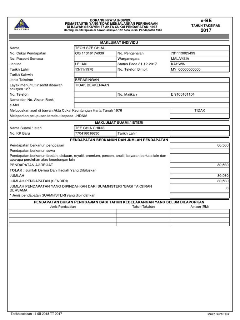 Borang '52 cukai pendapatan malaysia penyata pendapatan orang perseorangan return of income by an.